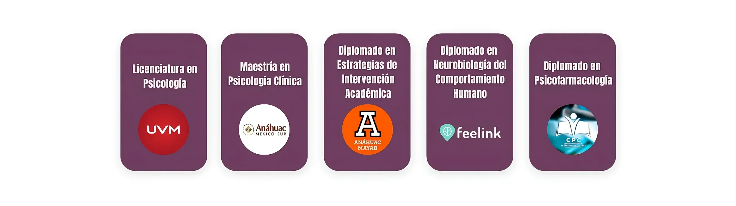Psicoterapeuta Cognitivo-Conductual comprometida con ofrecer un espacio seguro, empático y basado en evidencia científica. Formación: Licenciatura en Psicología Universidad del Valle de México, Maestría en Psicología Clínica Integrativa Universidad Anáhuac México, Diplomado en Estrategias de Intervención Psicológica Universidad Anáhuac Mayab, Diplomado en Neurobiología del Comportamiento Humano por Feelink, Diplomado en Psicofarmacología Centro Profesional de Capacitación Continua